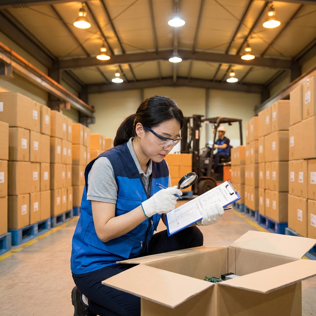 전수검사는 제품 전량을 100% 개봉하여 하나하나 육안 및 기능 테스트를 거치는 검사 방식입니다.